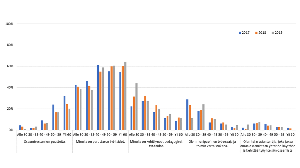 Opettajien osaaminen näyttäytyy tulosten valossa kaksijakoiselta. Toisaalta tulokset eivät ole ICT-taitotestin perusteella parantuneet juurikaan kolmen vuoden aikana, mutta itsearviointien perusteella edistymistä on kuitenkin tapahtunut kaikissa ikäluokissa: