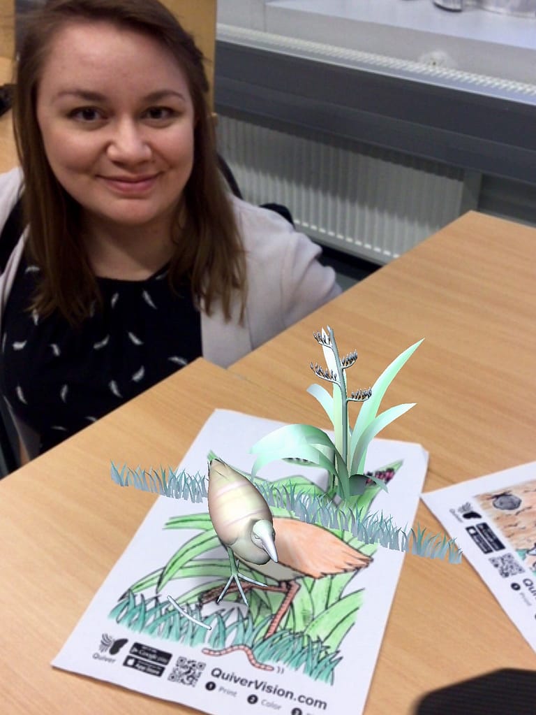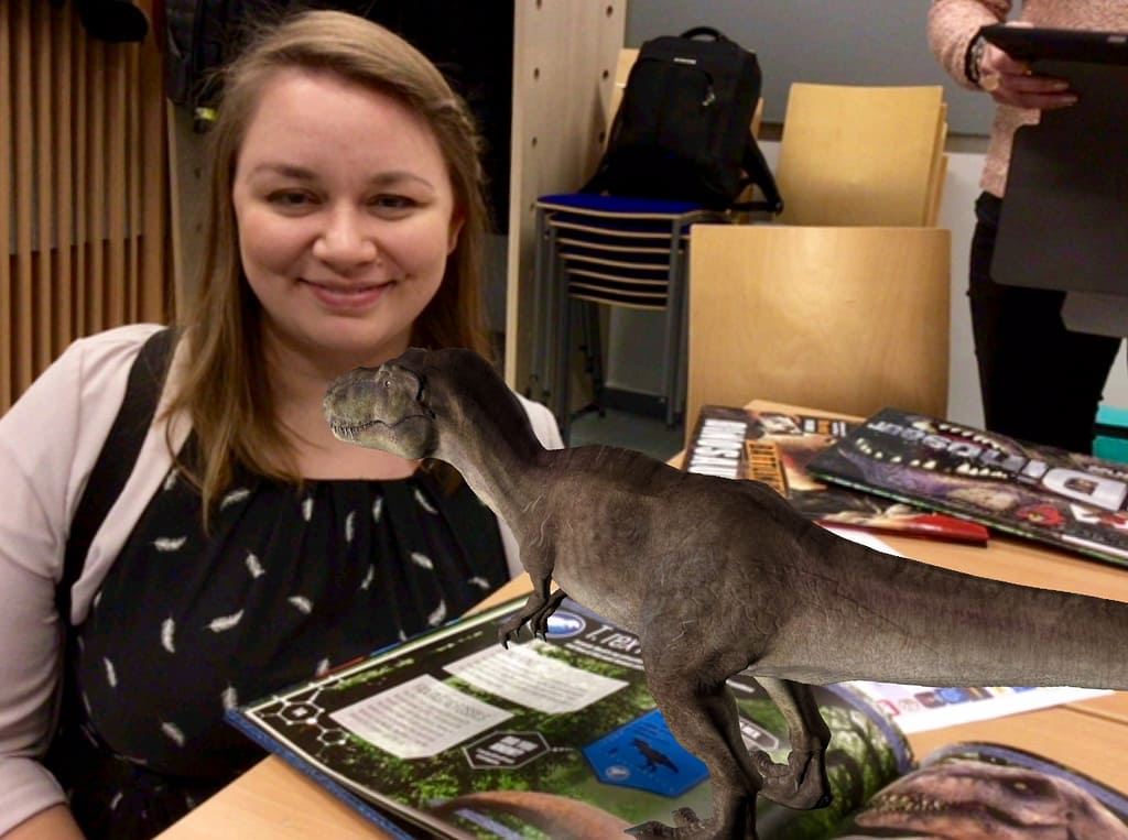 Päivän aikana pääsin mm. kuvaan dinosauruksen kanssa ja pääsin kurkistamaan elimistön sisälle. Virtuali-tee –sovelluksella pääsee näkemään kaverin ihon alle ja tutkimaan ihmiskehon anatomiaa iPadilla tai VR-laseilla, kun kaveri laittaa päälleen sovellukseen liittyvän t-paidan. Pääsimme selaamaan myös AR-kirjoja, joiden kuvat heräsivät eloon, ja esimerkiksi aurinkokunnan mallia pystyi katsomaan eri kulmista, kun sitä katsoi iPadin kameran läpi. Myös dinosaurukset heräsivät eloon samalla konstilla!