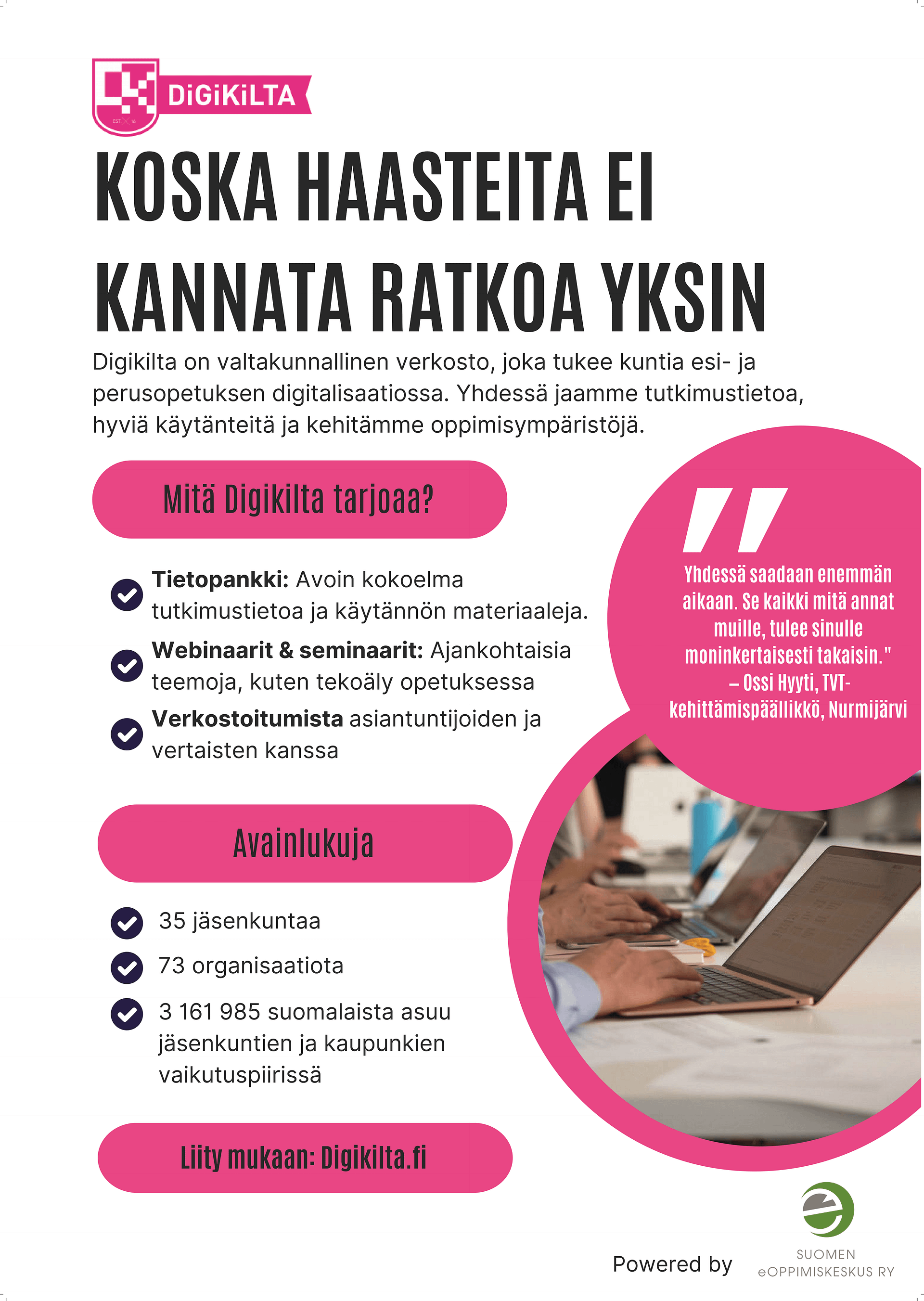 eOppimiskeskus on valtakunnallinen yhdistys, joka edistää digitaalisia opiskelu- ja työskentelytaitoja. Fasilitoimme Digikilta-verkoston toimintaa.